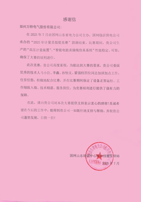2025年7月,由國(guó)網(wǎng)山東省電力公司主辦、國(guó)網(wǎng)臨沂供電公司承辦的“2025年計(jì)量員技能競(jìng)賽”在臨沂圓滿落幕。公司為本次競(jìng)賽提供的競(jìng)賽用產(chǎn)品憑借穩(wěn)定可靠的性能,保障了大賽的順利進(jìn)行,獲得主辦方高度評(píng)價(jià)。